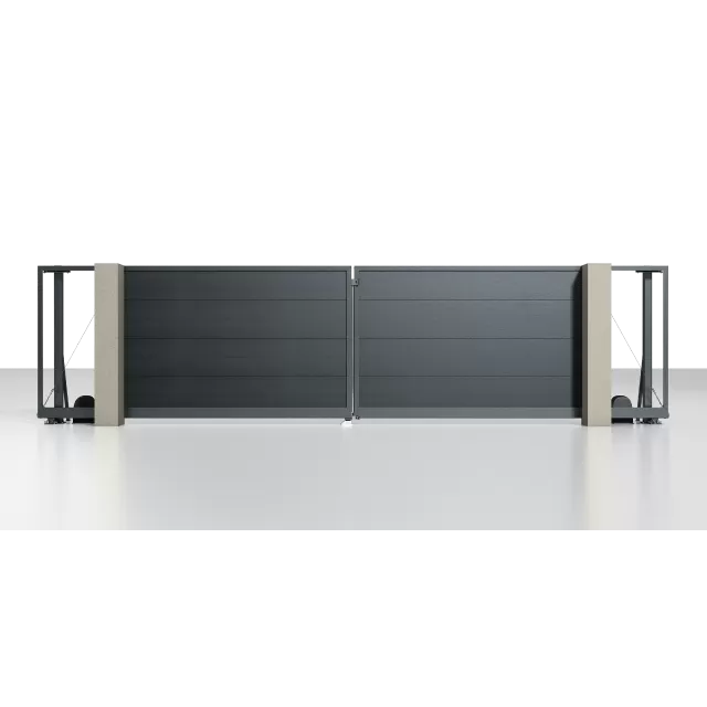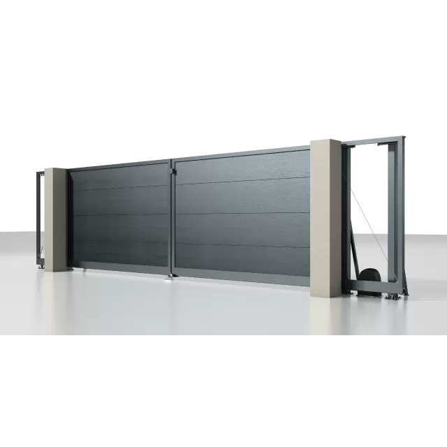 Рама: 96 мм. Комбинированное заполнение: сэндвич-панель L-гофр и разреженный профиль 37 мм. цвета «Серый антрацит» (RAL 7016). Автоматика ALUTECH Roteo