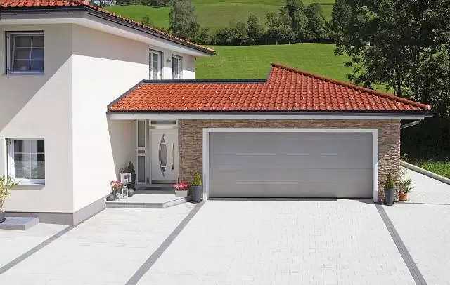 для отдельного входа-выхода. Дверь гармонично сочетается с гаражными воротами, придавая фасаду дома завершенный вид