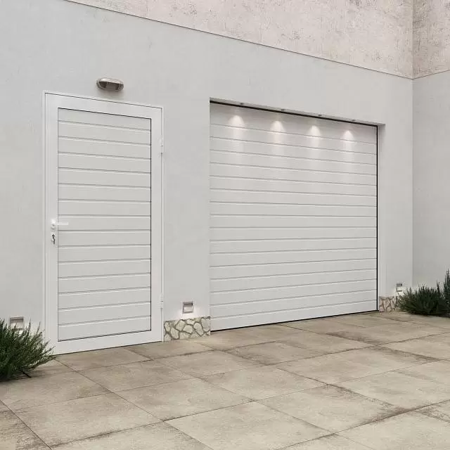 для отдельного входа-выхода. Дверь гармонично сочетается с гаражными воротами, придавая фасаду дома завершенный вид