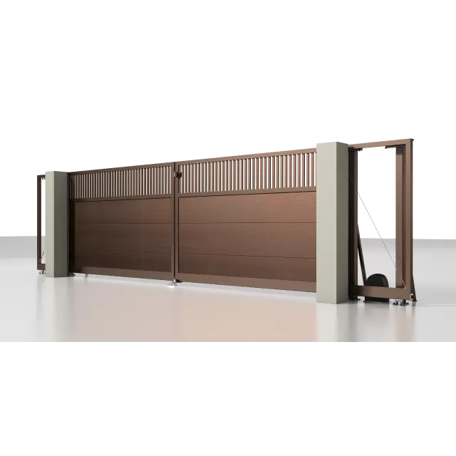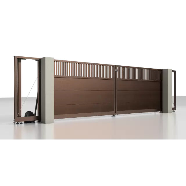 Рама: 96 мм. Комбинированное заполнение: сэндвич-панель L-гофр и разреженный профиль 37 мм. цвета «Серый антрацит» (RAL 7016). Автоматика ALUTECH Roteo